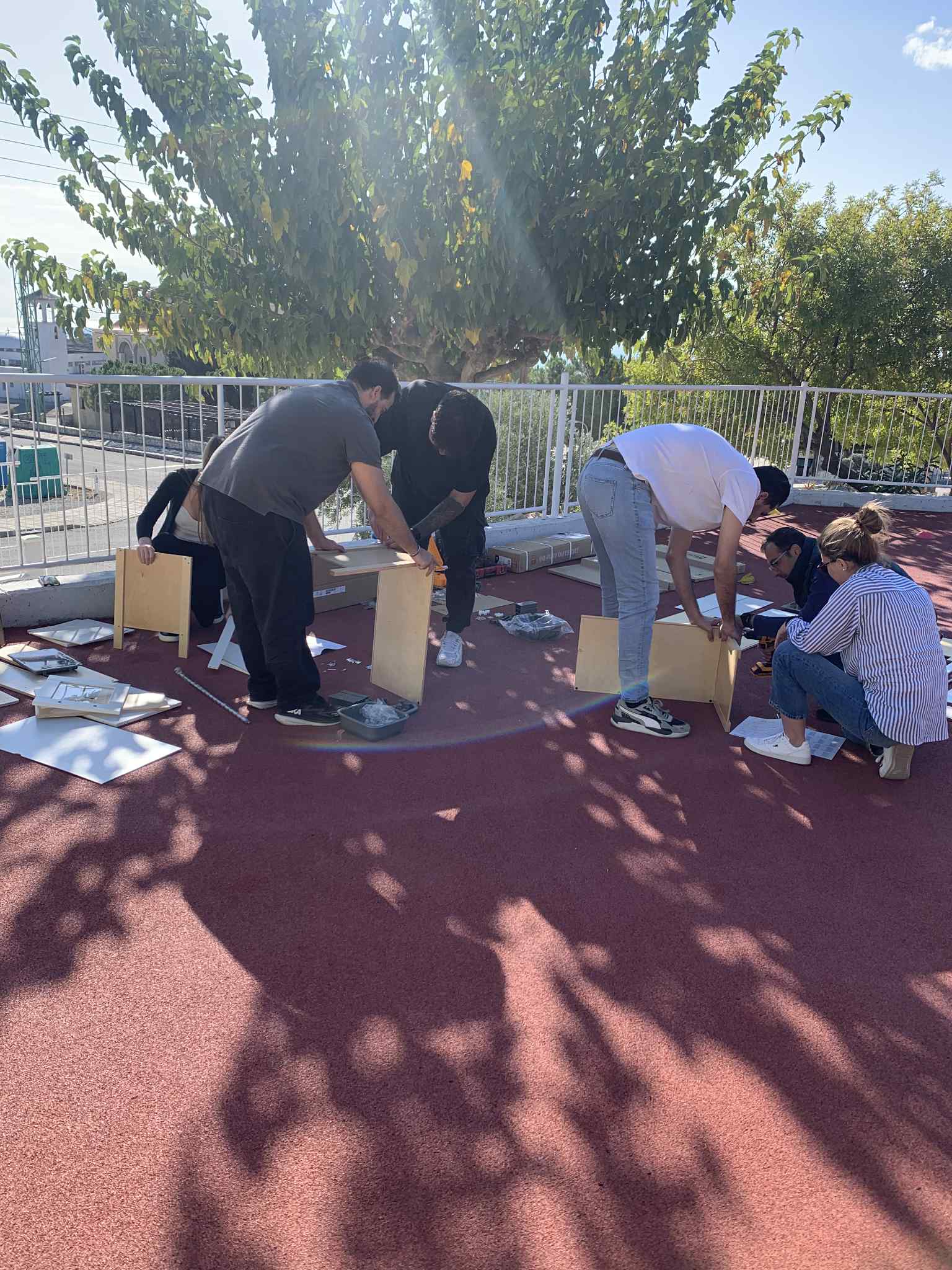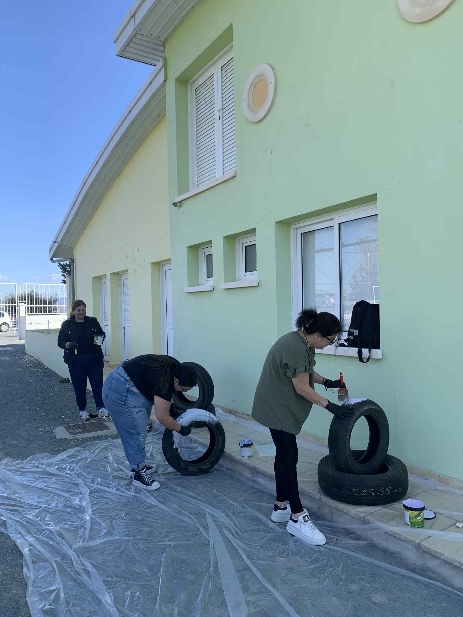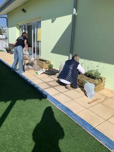 Στόλισαν την αυλή με ανθώνες και λουλούδια. Έβαλαν παγκάκι για ξεκούραση και παιχνίδια στην αμμοδόχο.